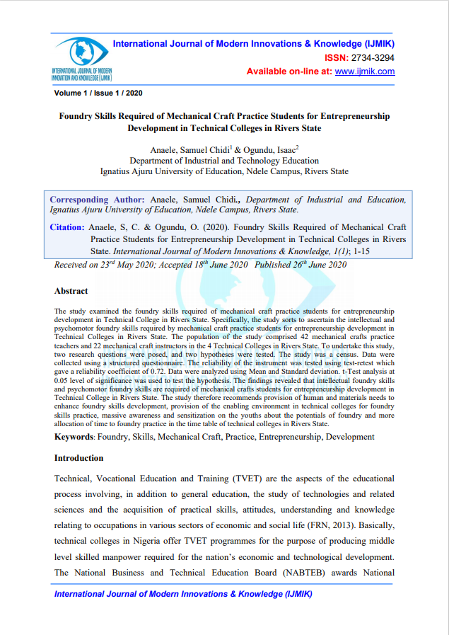 Foundry Skills Required of Mechanical Craft Practice Students for Entrepreneurship Development in Technical Colleges in Rivers State. (2020). International Journal of Modern Innovations and Knowledge, 1(1), 1-15. https://ijmik.net/index.php/ijmik/article/view/1