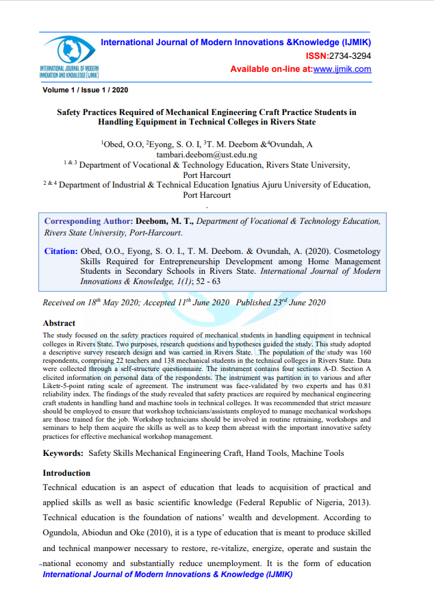 Safety Practices Required of Mechanical Engineering Craft Practice Students in Handling Equipment in Technical Colleges in Rivers State. (2020). International Journal of Modern Innovations and Knowledge, 1(1), 52-63. https://ijmik.net/index.php/ijmik/article/view/11