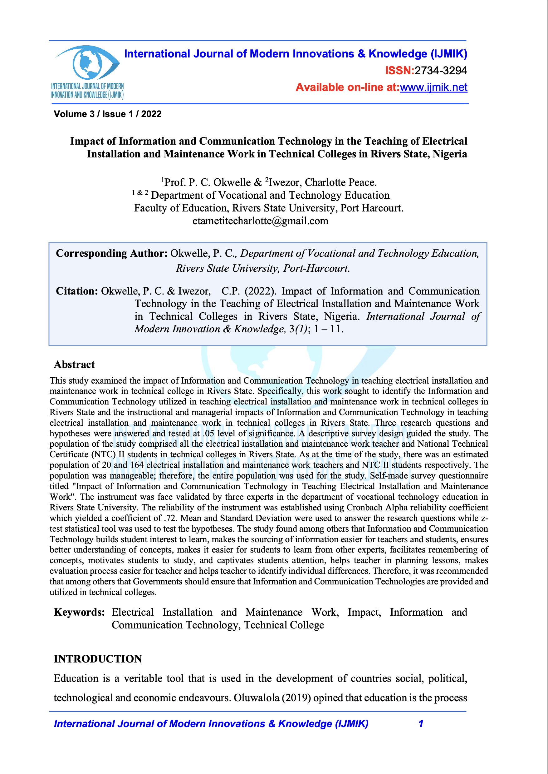 Impact of Information and Communication Technology in the Teaching of Electrical Installation and Maintenance Work in Technical Colleges in Rivers State, Nigeria. (2025). International Journal of Modern Innovations and Knowledge, 3(1), 1-11. https://ijmik.net/index.php/ijmik/article/view/116