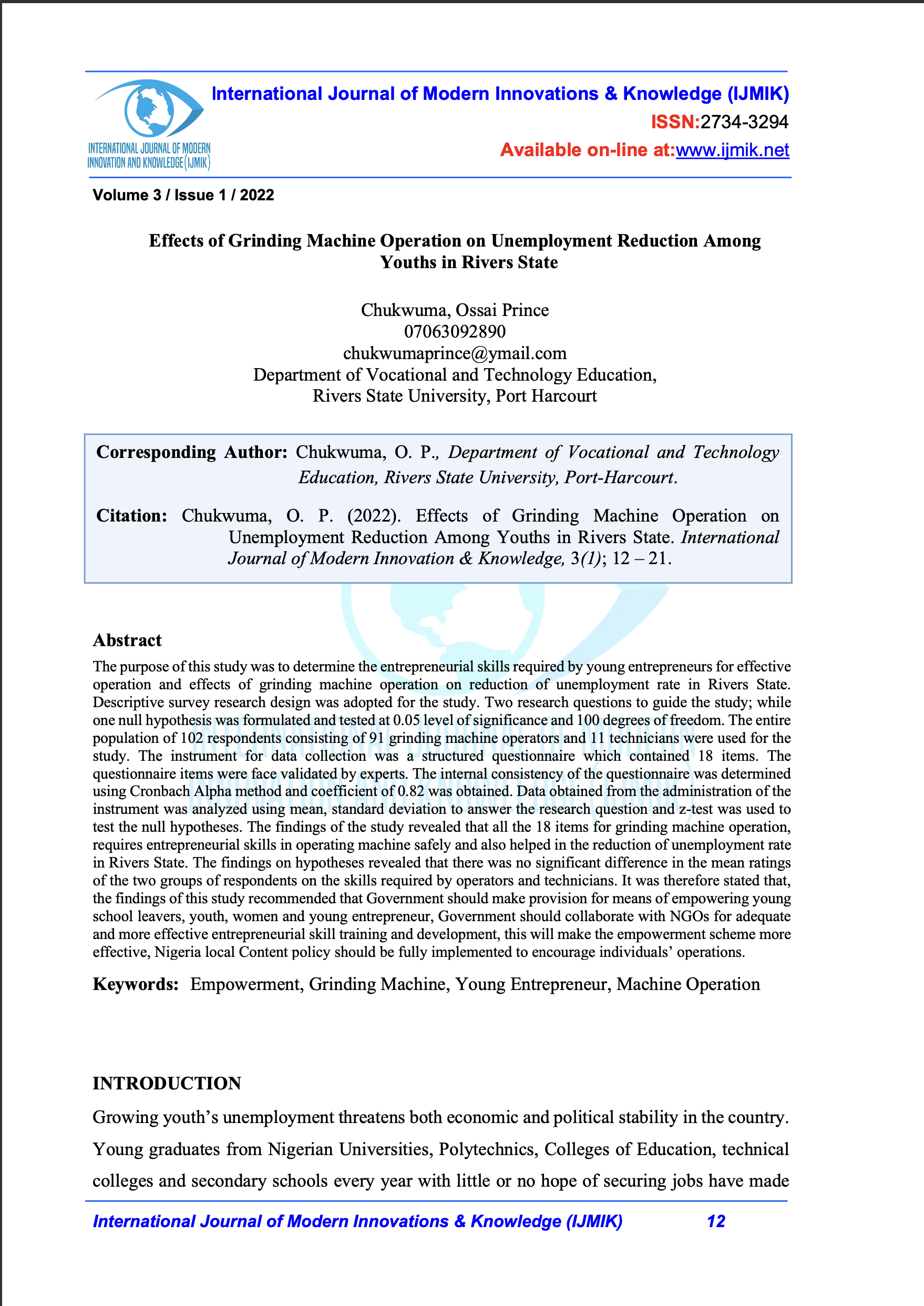 The purpose of this study was to determine the entrepreneurial skills required by young entrepreneurs for effective operation and effects of grinding machine operation on reduction of unemployment rate in Rivers State. Descriptive survey research design was adopted for the study. Two research questions to guide the study; while one null hypothesis was formulated and tested at 0.05 level of significance and 100 degrees of freedom. The entire population of 102 respondents consisting of 91 grinding machine operators and 11 technicians were used for the study. The instrument for data collection was a structured questionnaire which contained 18 items. The questionnaire items were face validated by experts. The internal consistency of the questionnaire was determined using Cronbach Alpha method and coefficient of 0.82 was obtained. Data obtained from the administration of the instrument was analyzed using mean, standard deviation to answer the research question and z-test was used to test the null hypotheses. The findings of the study revealed that all the 18 items for grinding machine operation, requires entrepreneurial skills in operating machine safely and also helped in the reduction of unemployment rate in Rivers State. The findings on hypotheses revealed that there was no significant difference in the mean ratings of the two groups of respondents on the skills required by operators and technicians. It was therefore stated that, the findings of this study recommended that Government should make provision for means of empowering young school leavers, youth, women and young entrepreneur, Government should collaborate with NGOs for adequate and more effective entrepreneurial skill training and development, this will make the empowerment scheme more effective, Nigeria local Content policy should be fully implemented to encourage individuals’ operations.