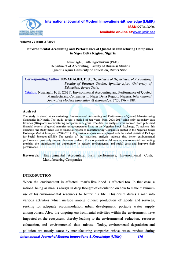 Environmental Accounting and Performance of Quoted Manufacturing Companies in Niger Delta Region, Nigeria