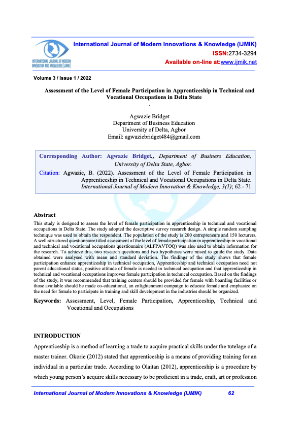 Assessment of the Level of Female Participation in Apprenticeship in Technical and Vocational Occupations in Delta State