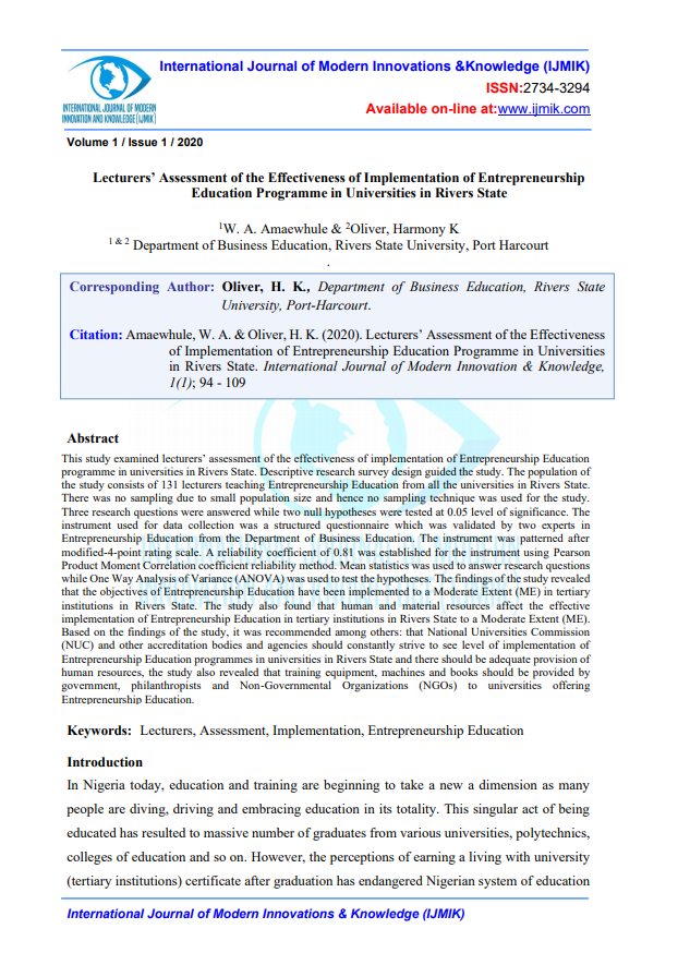 This study examined lecturers’ assessment of the effectiveness of implementation of Entrepreneurship