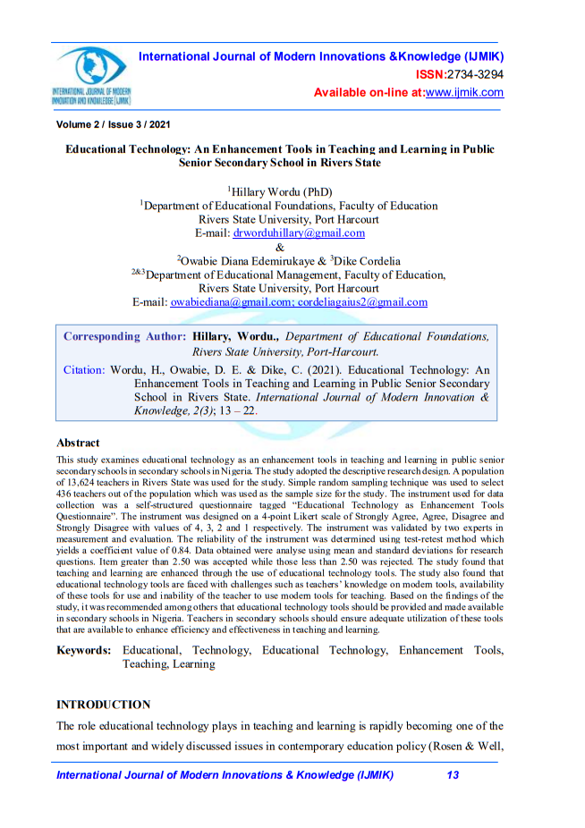 This study examines educational technology as an enhancement tools in teaching and learning in public senior secondary schools in secondary schools in Nigeria. The study adopted the descriptive research design. A population of 13,624 teachers in Rivers State was used for the study. Simple random sampling technique was used to select 436 teachers out of the population which was used as the sample size for the study. The instrument used for data collection was a self-structured questionnaire tagged “Educational Technology as Enhancement Tools Questionnaire”. The instrument was designed on a 4-point Likert scale of Strongly Agree, Agree, Disagree and Strongly Disagree with values of 4, 3, 2 and 1 respectively. The instrument was validated by two experts in measurement and evaluation. The reliability of the instrument was determined using test-retest method which yields a coefficient value of 0.84. Data obtained were analyse using mean and standard deviations for research questions. Item greater than 2.50 was accepted while those less than 2.50 was rejected. The study found that teaching and learning are enhanced through the use of educational technology tools. The study also found that educational technology tools are faced with challenges such as teachers’ knowledge on modern tools, availability of these tools for use and inability of the teacher to use modern tools for teaching. Based on the findings of the study, it was recommended among others that educational technology tools should be provided and made available in secondary schools in Nigeria. Teachers in secondary schools should ensure adequate utilization of these tools that are available to enhance efficiency and effectiveness in teaching and learning.
