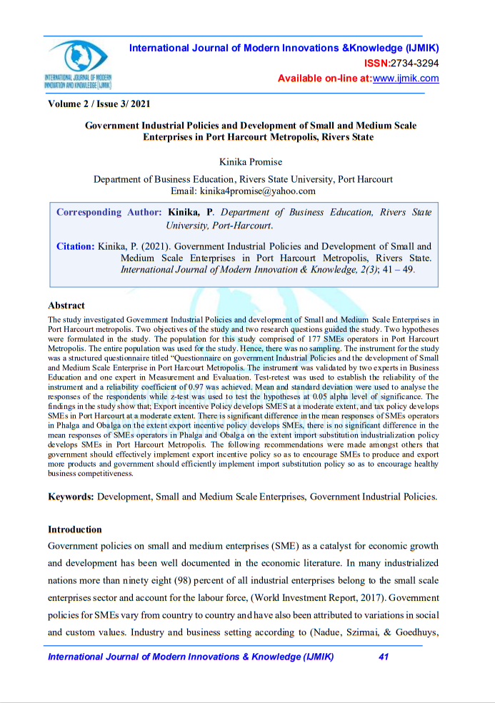 Government Industrial Policies and Development of Small and Medium Scale Enterprises in Port Harcourt Metropolis, Rivers State. (2021). International Journal of Modern Innovations and Knowledge, 2(3), 41-49. https://ijmik.net/index.php/ijmik/article/view/57