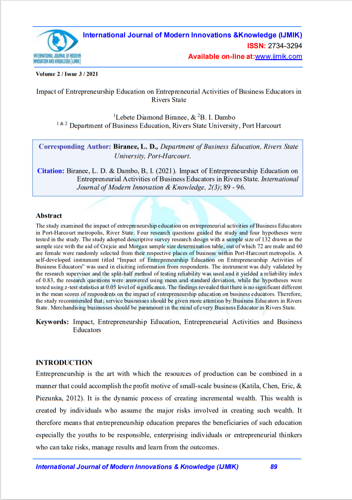 Impact of Entrepreneurship Education on Entrepreneurial Activities of Business Educators in Rivers State